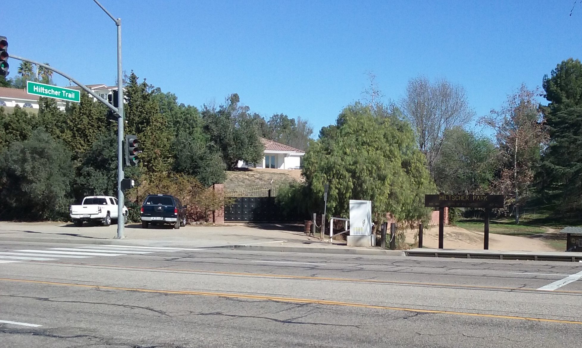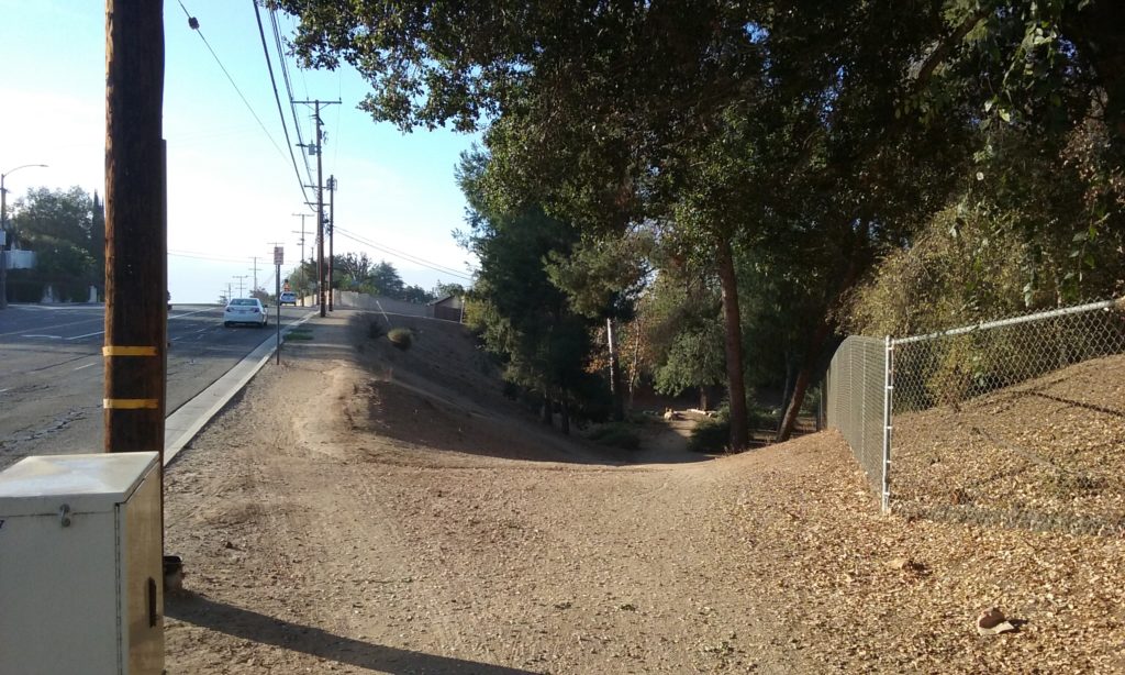 The starting point for the journeys described above was the six or eight parking places on Euclid where the street sign actually says “Hiltscher Trail” click here–> Hiltscher Trail Parking. Behind the camera the trail continues up the steepest grade of the Fullerton Loop. Walkers won’t have any trouble but once at the top, there’s no place to go, really. Bikers have almost a mile of street to ride on before it gets back on dirt again. But for walkers there’s no interesting goal. There’s maybe Fern Drive Park (adjacent to Fern Drive School). That’s one block south and 1/2 mile west. But it doesn’t even have picnic tables.